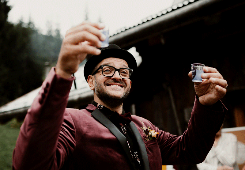 Que diriez-vous d’un mariage alternatif dans les Alpes ? Je reformule, que diriez-vous d’un mariage de dingo dans la forêt, avec des cabanes suspendues dans les arbres, un sentier impraticable en voiture, de la si bonne musique, une robe de mariée noire, des vaches et des boissons aux couleurs étranges ?